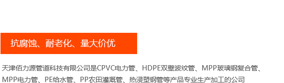 天津佰力源管道科技有限公司是熱浸塑鋼管、涂塑鋼管、MPP電力管、CPVC電力管、HDPE雙壁波紋管、MPP玻璃鋼復合管、MPP電力管、PE給水管、PP農田灌溉管、熱浸塑鋼管等產品專業生產加工的公司,擁有完整、科學的質量管理體系。 天津佰力源管道科技有限公司的誠信、實力和產品質量獲得業界的認可。